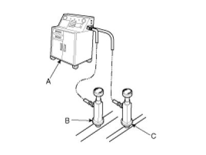 2. Connect an R-134a refrigerant Recovery/Recycling/Charging System (A) to the high-pressure service port (B) and the low-pressure service port (C) as shown, following the equipment manufacturer's instructions.