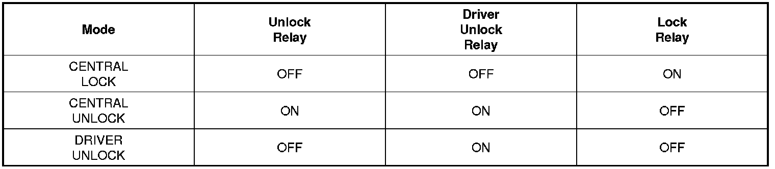 (1) If Driver Door Key Unlock Switch turns OFF from ON within T1 after Driver Door Key Unlock Switch turns ON from OFF(Driver Door Unlock Switch becomes UNLOCKED mechanically and does not output BCM.), turn Driver Unlock Relay, Unlock Relay(Central Unlock) output ON during T2.