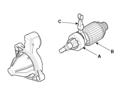7. Remove the overrunning clutch (A), armature (B) and lever (C).