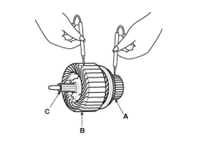 9. Check with an ohmmeter that no continuity exists between the commutator (A) and armature coil core (B), and between the commutator and armature shaft (C). If continuity exists, replace the armature.