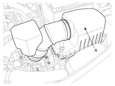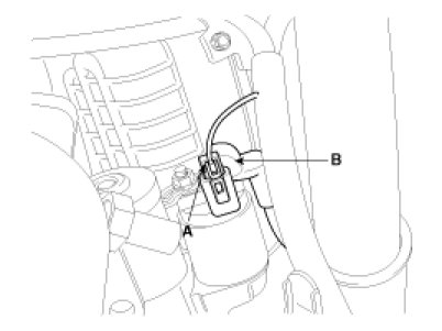 3. Disconnect the starter cable (B) from the B terminal on the solenoid, then disconnect the connector (A) from the S terminal.