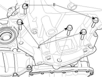 2. Install the transaxle lower mounting bolts (A-3ea, B-2ea) after fitting the transaxle assembly into the engine assembly.