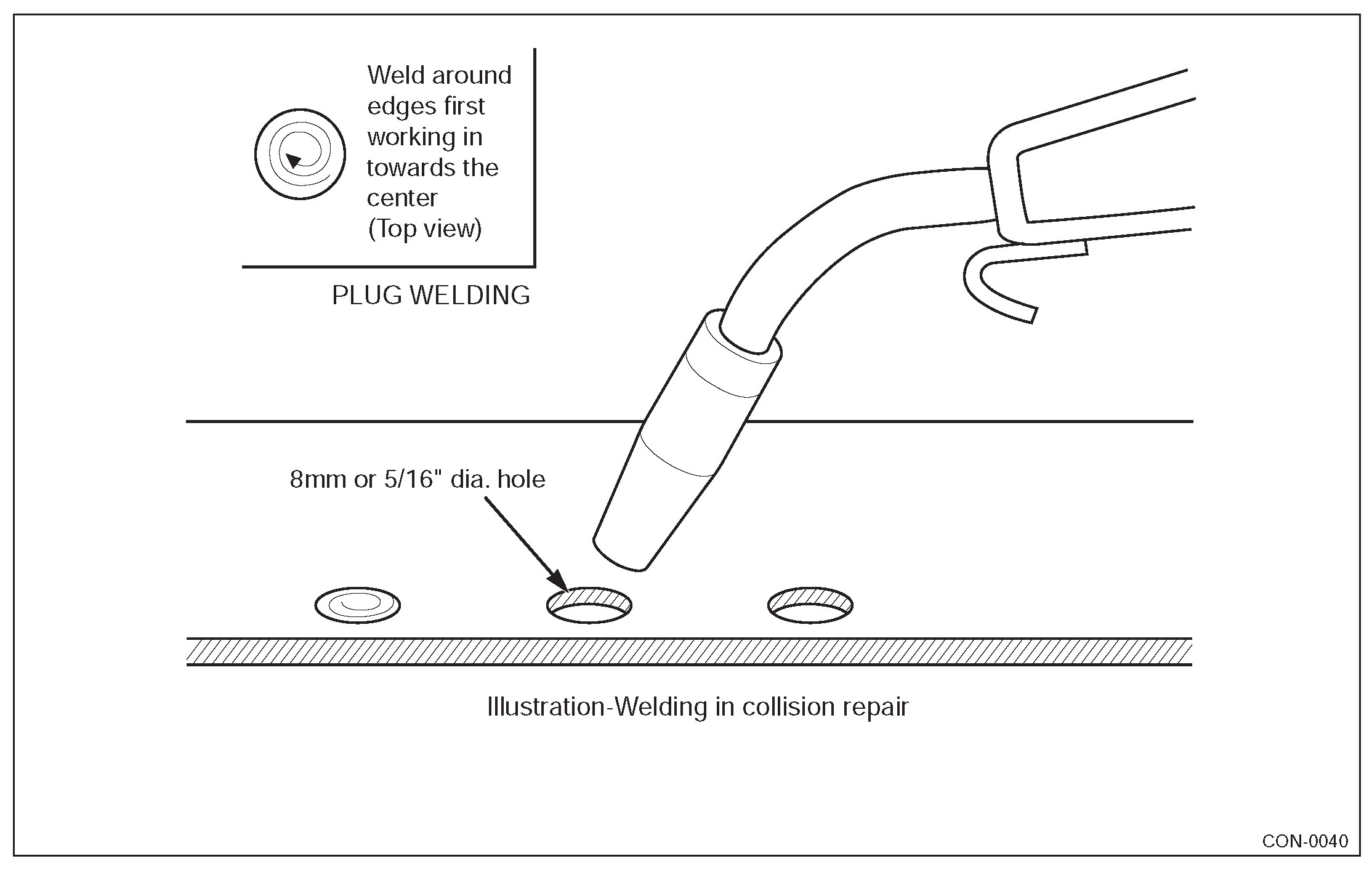 During the repair process, plug welds are used to duplicate original factory spot welds. All plug welds should be done with the MIG welder. An 8 mm (5/16") hole is placed in the top (welding side) sheetmetal.