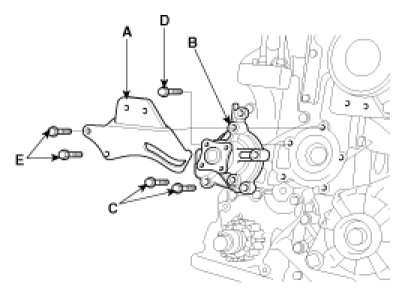 Install the water pump (B) and a new gasket with the 3 bolts (C, D).
