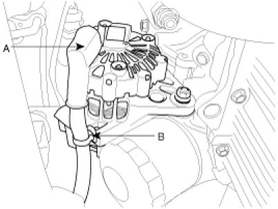2. Disconnect the alternator connector(A) and "B" terminal cable from the alternator. Loosen the clip(B).