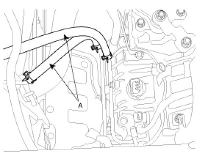 14. Connect the transaxle oil cooler hoses (A) to the tubes by fastening the clamps.