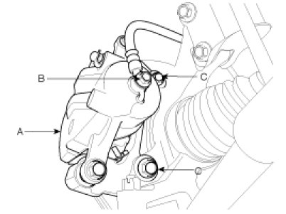 2. Loosen the hose eye-bolt (B) and caliper mounting bolts (C), then remove the front caliper assembly (A).