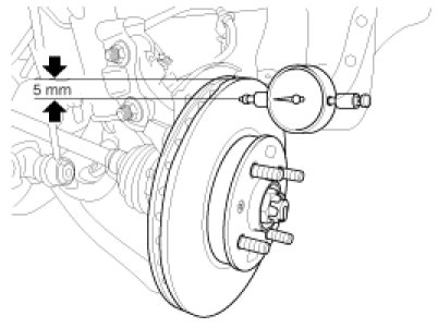 1. Place a dial gauge about 5mm (0.2 in.) from the outer circumference of the brake disc, and measure the runout of the disc.
