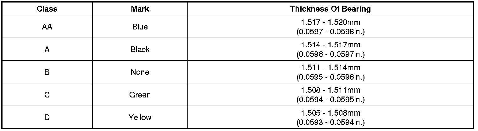 (6) If the plastigage measures too wide or too narrow, remove the upper half of the bearing, install a new, complete bearing with the same color mark (select the color as shown in the next column), and recheck the clearance.