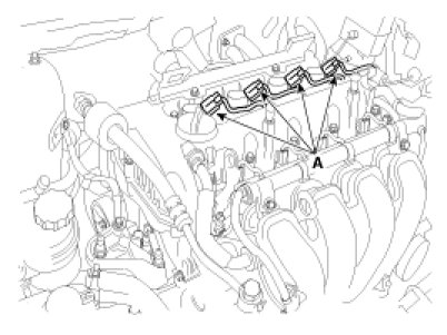 1. Disconnect the ignition connectors (A), and then remove the ignition coils.