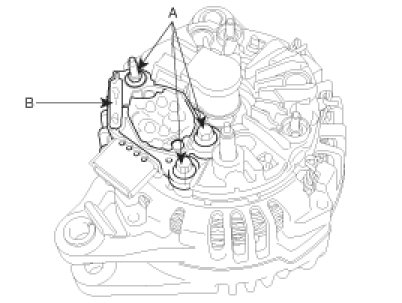 2. Loosen the mounting bolts (A) and disconnect the brush holder assembly (B).