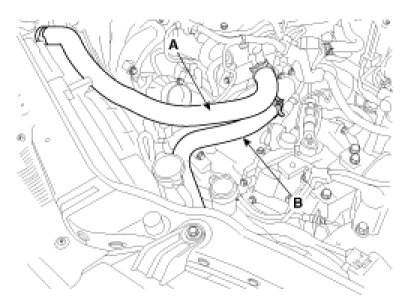 3. Remove the radiator upper hose (A) and lower hose (B) and reservoir hose.