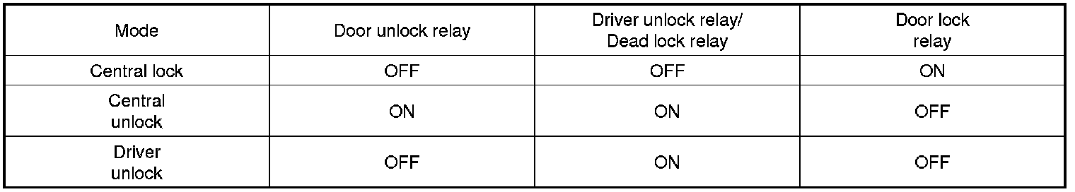 (1) If Driver door Key Unlock Switch turns OFF from ON within T1 after Driver door Key Unlock Switch turns ON from OFF(Driver door Unlock Switch becomes UNLOCKED mechanically and does not output BCM.), turn Door Unlock Relay output ON during T2.