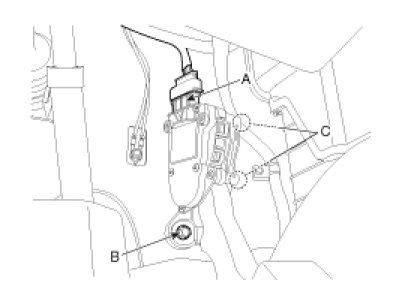 3. Remove the mounting bolt (B) and nuts (C), and then remove the accelerator pedal from the vehicle.