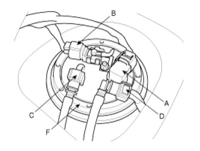 5. Disconnect the fuel pump connector (A) and the fuel tank pressure sensor connector (B).