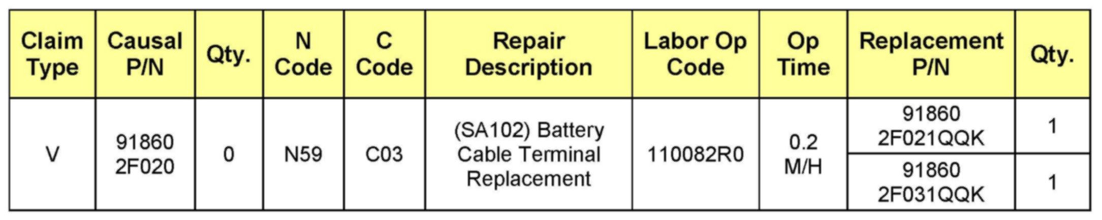 This bulletin provides information relating to the Positive (+) and Negative (-) battery cable terminal replacement on Forte vehicles produced from May 01, 2011 to June 30, 2011. Kia is requesting the completion of this Service Action on all affected 2011/12MY Forte (TD) vehicles prior to delivery. Before conducting the procedure, verify that the vehicle is included in the list of the affected VINs.
