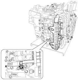 5. Remove the bolt (3ea) after disconnecting the solenoid valve connector (B) and the oil temperature sensor connector (A).