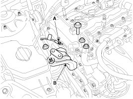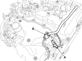 17. Disconnect the PCV (Positive crankcase ventilation) hose (A) and then remove the front engine hanger (B).