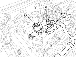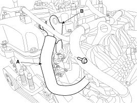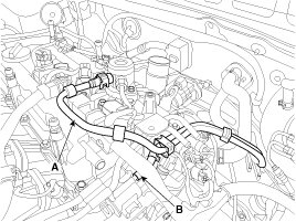 13. Disconnect the fuel hose (A) and PCSV (Purge control solenoid valve) hose (B).