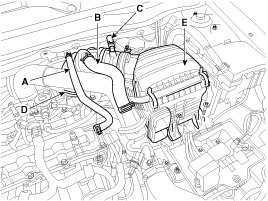 (2) Disconnect the air intake hose (D) and then remove the air cleaner assembly (E).