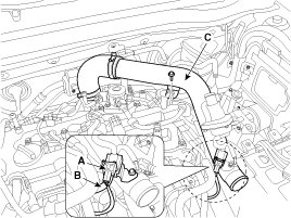 (1) Disconnect the breather hose (A), the recirculation hose (B) and the brake booster vacuum hose (C).