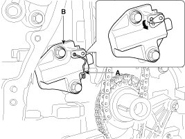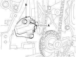 7. Install the timing chain auto tensioner (B) and remove the stopper pin (A).