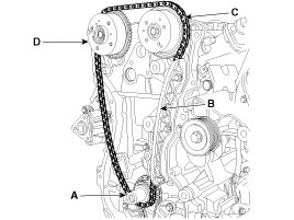 Crankshaft sprocket (A) -> Timing chain guide (B) -> Intake CVVT sprocket (C) -> Exhaust CVVT sprocket (D).