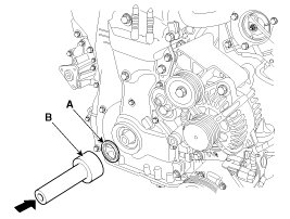 11. Install the crankshaft front oil seal (A) using SST (09214-3K000, 09231-H1100) (B).