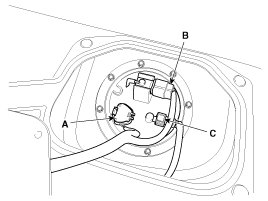 3. Disconnect the fuel pump connector (A) and the fuel tank pressure sensor connector (B).
