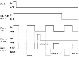 2. If Signal "BCM KEY IN" transmitted from BCM and signal "LOCAL KEY IN" in case that key is removed are changed from "LOW"(KEY IN) ->"HIGH" (KEY OFF), SEAT SLIDE is moved 50mm backward from KEY OUT position.