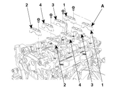 (2) Remove the camshaft bearing cap (A) in the sequence shown.