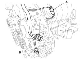 (3) The OPS (Oil pressure switch) connector (A), the A/C compressor switch connector (B) and the HSG (Hybrid starter generator) sensor connector (C)