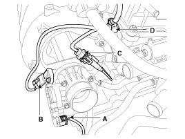 (6) The ETC (Electronic throttle control) connector (A), the MAPS (Manifold absolute pressure sensor) & IATS (Intake air temperature sensor) connector (B), the knock sensor connector (C) and the intake CMPS (Camshaft position sensor) connector (D)