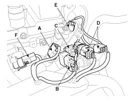 (7) The ECTS (Engine coolant temperature sensor) connector (A), the condenser connector (B), the CKPS (Crankshaft position sensor) connector (C), the oxygen sensor connectors (D), the exhaust CMPS (Camshaft position sensor) connector (E) and the PCSV (Purge control solenoid valve) connector (F)