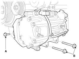 14. Remove one side bolt (A) and two lower bolts (B) on the A/C compressor.