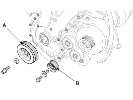 20. Remove the crankshaft pulley (A) and the idler (B).