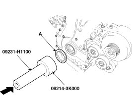 11. Install the crankshaft front oil seal (A) using SST (09214-3K000, 09231-H1100).