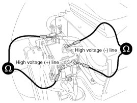 5. Connect the insulation tester (+) terminal to the high voltage battery (+) and (-). Measure the resistance.