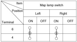 Remove the overhead console lamp assembly then check for continuity between terminals. If the continuity is not as specified, replace the map lamp switch.