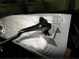 (2) Slightly spread open the front pillar trim and then place the tool (A) on the mounting clip (B) like the picture below.