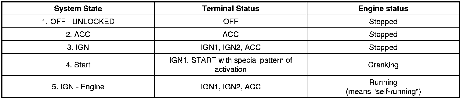 Referring to the terminals, the system states described in the table above are same as those one found in a system based on a mechanical ignition switch.
