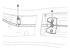 2. Install the parking brake cable (B) and then cable retainer (A).