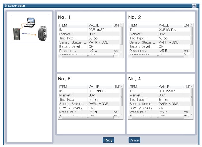 - After replacing the tires or sensors, check the status of sensor is working properly after sensor registration process.