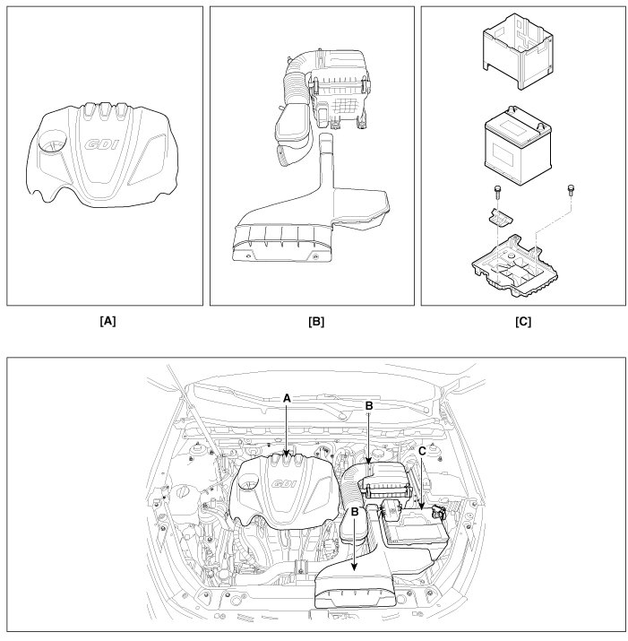 8. Remove the automatic transaxle upper mounting bolt (A-2ea) and the starter motor mounting bolt (B-2ea).