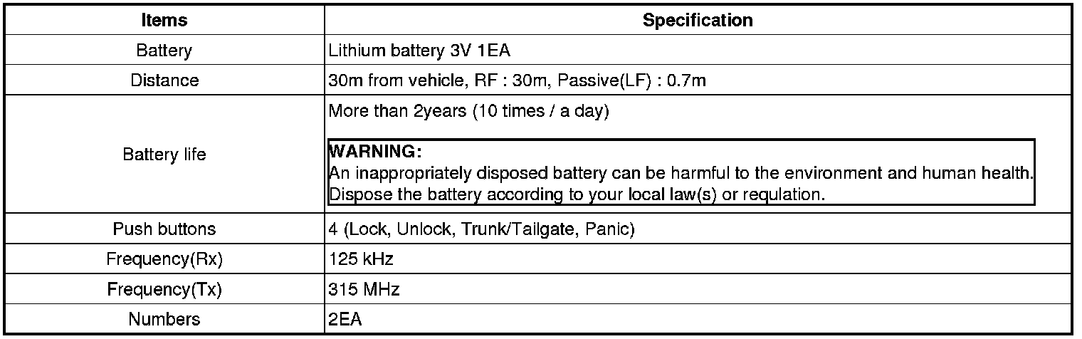Keyless Starting System: Specifications