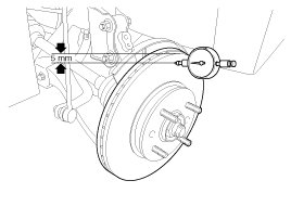 1. Place a dial gauge about 5mm (0.2 in.) from the outer circumference of the brake disc, and measure the runout of the disc.