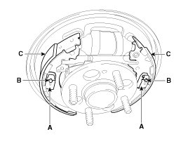 6. Remove the shoe hold springs (A) and shoe hold pins (B) and then remove brake shoe (C). Make sure not to damage the dust cover on the wheel cylinder.