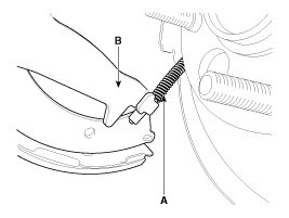 7. Remove the parking brake cable (A) and then remove brake shoe (B).