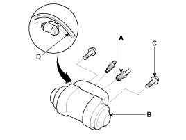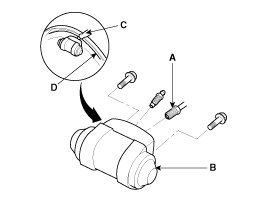 1. Apply sealant (C) between the wheel cylinder (B) and backing plate (D), and install the wheel cylinder.