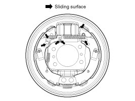 10. Apply brake cylinder grease or equivalent rubber grease to the sliding surfaces shown. Don't get grease on the brake linings.